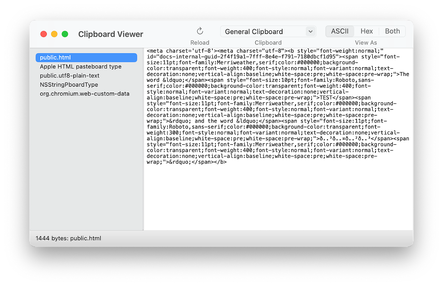If I select “The word ‘TEST’ and the word ‘𝖳𝖤𝖲𝖳’” from this document, I can see metadata in the clipboard adding information such as the font, line spacing, and alignment: