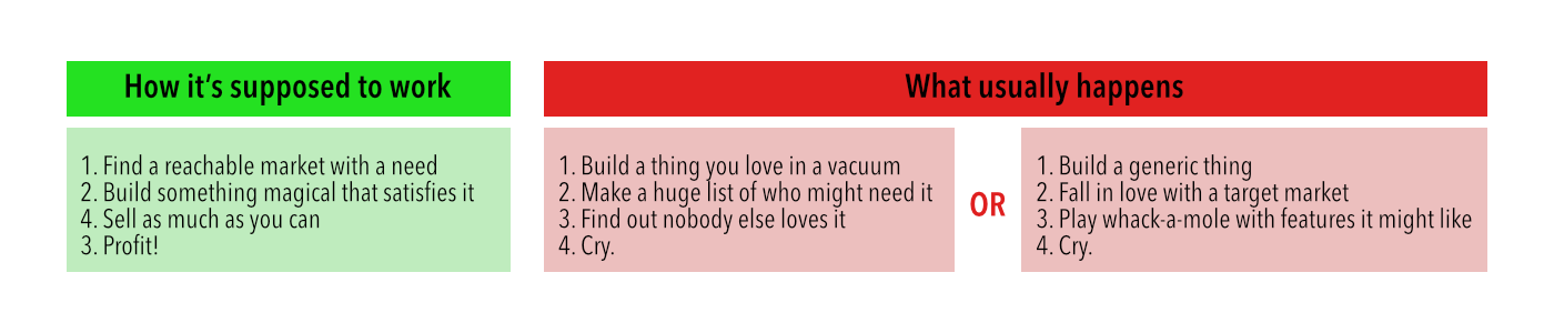 Unfortunately, startups seldom start by identifying a need through customer development. They spend much more time adjusting their product to a market they’re in love with than they do finding a market that loves what they already have.