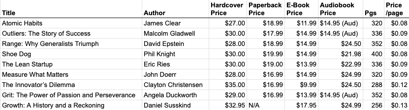 - Top-down: What do popular business books charge? This varies by size (and the resulting cost to print and ship.) At 416 pages, with an average price per page of just over $0.09, that’s around $37.44.