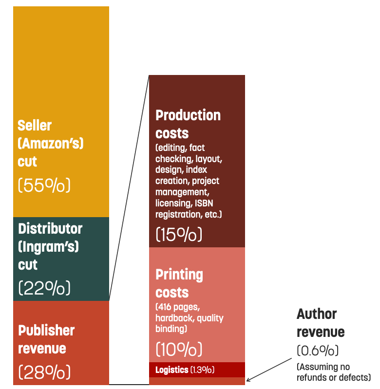That doesn’t include the costs of bringing the print-ready manuscript into the world. These are substantial. We went through 10 rounds of edits, extensive fact-checking, several iterations of layout with custom diagrams, the creation of an index, and project management, with the help of our publisher, Whitefox. Even the registering of an ISBN costs money.