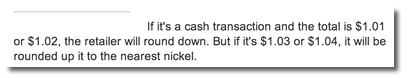 Rounding nickels is bad. We’re a metric country. We like orders of magnitude, and the decimal place. We know how to round up or down from an even numberit’s something we’ve all been taught in math class. Rounding to a nickel is counterintuitive. There are even signs on cash registers explaining how to do it now.
