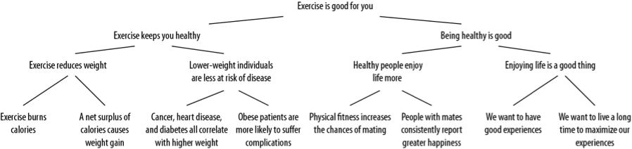 Notice how you can read it across the top (“exercise is good for you,” a simple title) or the bottom (“Exercise burns calories, and a net surplus of calories causes weight gain…”) This approach does two things: first, it forces you to be disciplined in your thinking about a subject. In the example above, certain things stand out: Do healthy people really enjoy life more? Is the ultimate goal of life to have many good experiences?