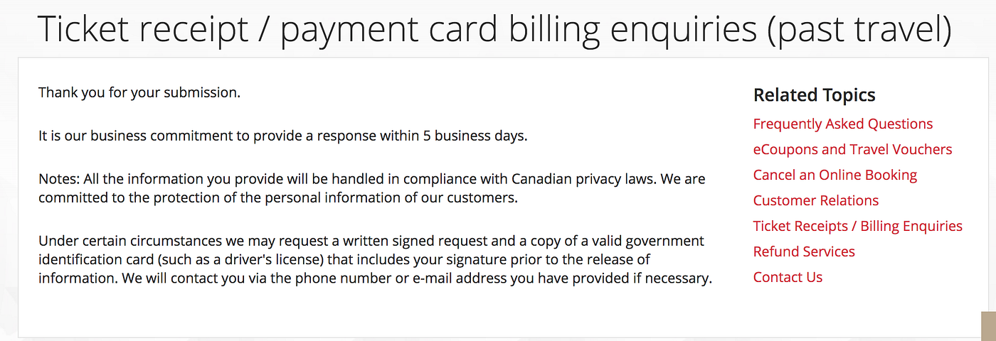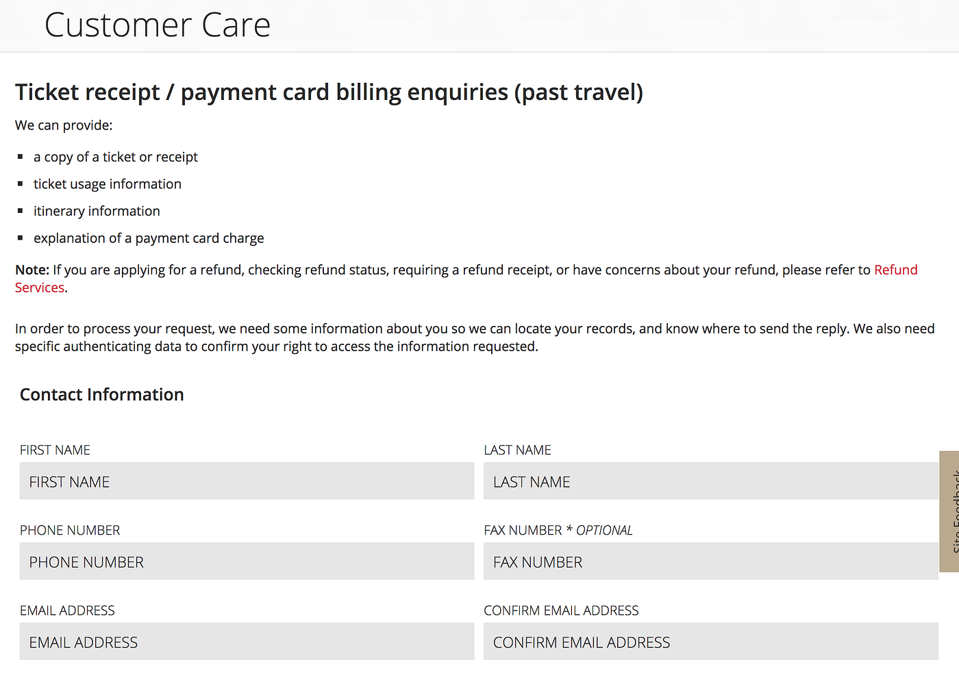 A couple of days later, when booking a flight, their purchase process locks up. I book the flight again, and then notice two charges on my credit card. So I call them and get them to cancel one of the charges. While I’m on the phone, I say, “perhaps you can help me. I’m trying to get a copy of a receipt but nobody seems to be answering.”