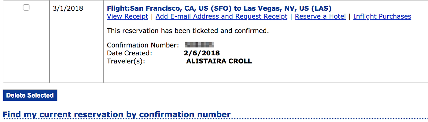There’s no way to search by six-character confirmation code. Oh, well, I guess I’ll click that box and enter all the required data.