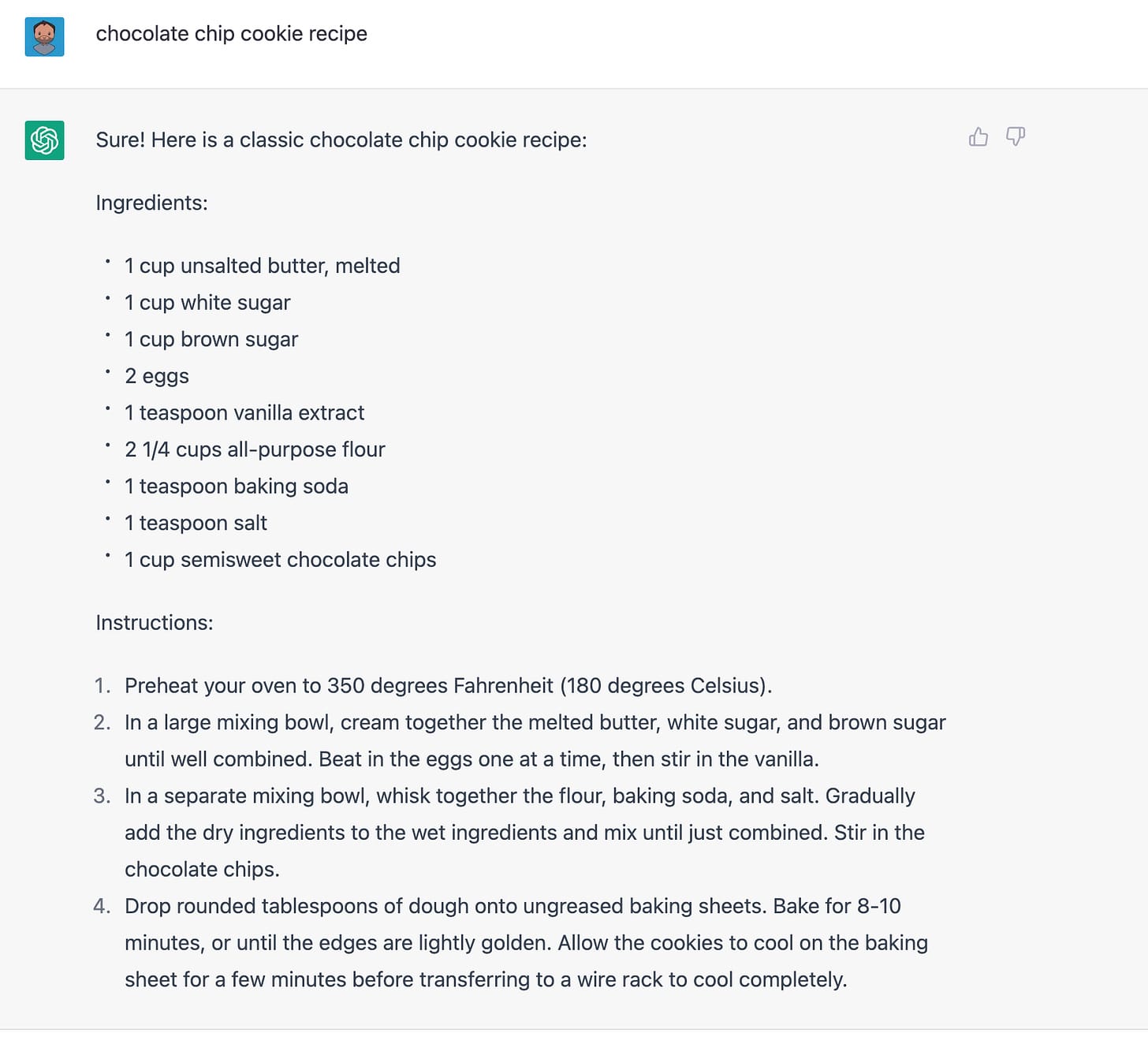 Any of those cookie ingredients could lead to a grocery store. The chatbot might also suggest that rather than baking, I order a delivery of cookies. And sure, with a chatbot, Google’s ad platform might learn from my cookie search that I’m interested in baking, or not very interested in my waistline. Which is great, but doesn’t really help if it doesn’t have ads to sell.